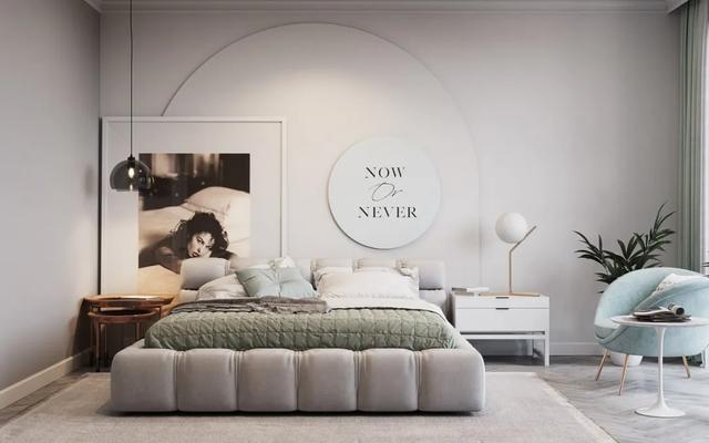 全室以不同色阶的灰色混搭绿色为基础,并在各处摆放绿意活力的盆栽点缀,使得整体空间呈现清新乾淨的视觉感,人字拼木地板让简约空间生动了起来,线条上多见圆弧形,像是拱门形柜体、半圆弧形镜子、圆弧形床头背版等,赋予空间柔和的变化性;并以大幅黑白人像摄影照和标语背板点缀墙面,体现出屋主的优雅性格及生活态度。